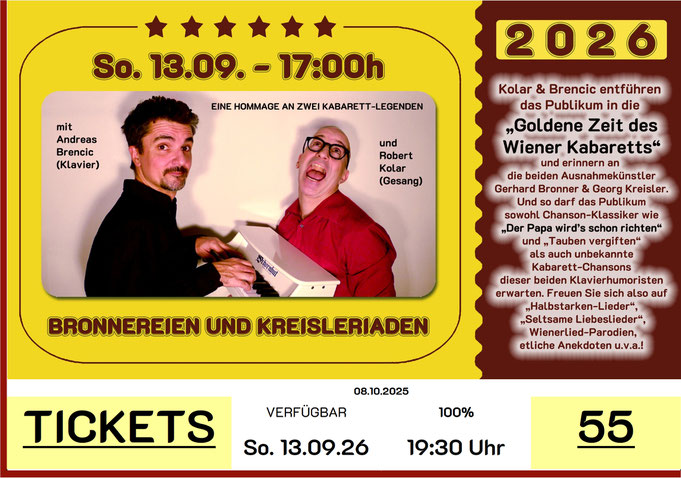 INFO: Bei Gastspielen sind die reservierten Karten immer zur Barzahlung an der Abendkassa hinterlegt - es ist keine Überweisung möglich!!! Kartenpreis einheitlich: 40,00€ inklusive einem Snack und einem Freigetränk in der Pause - wir freuen uns auf Sie...