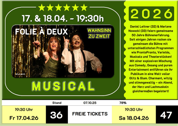 INFO: Bei Gastspielen sind die reservierten Karten immer zur Barzahlung an der Abendkassa hinterlegt - es ist keine Überweisung möglich!!! Kartenpreis einheitlich: 40,00€ inklusive einem Snack und einem Freigetränk in der Pause - wir freuen uns auf Sie...